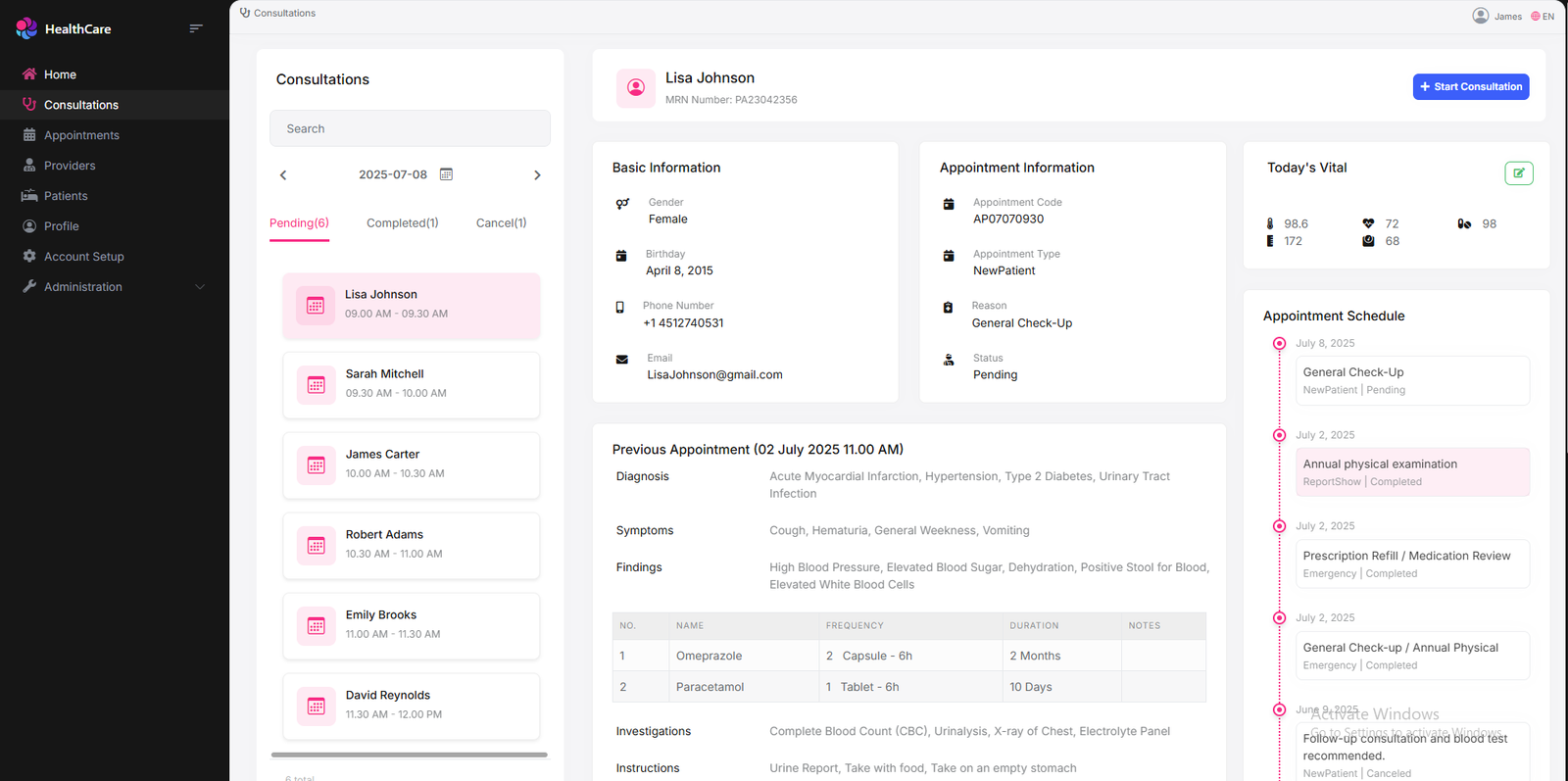 Intuitive access to patient, consultation, and administrative details.
